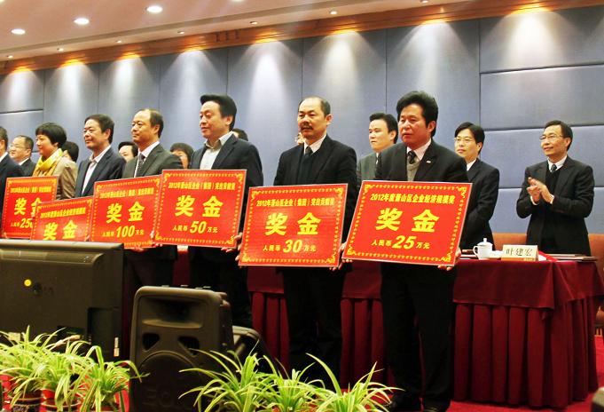 二月十六日,萧山区在萧山蓝天宾馆召开2012年度总结表彰大会。公司董事长、总经理孙锦龙参加了会议,并上台接受区领导颁发的“突出贡献奖”奖牌和30万元奖金。2012年,继续保持“区百强企业”的称号。