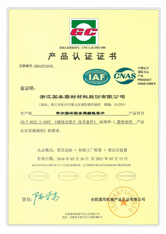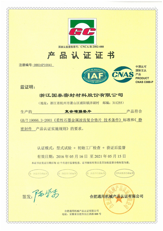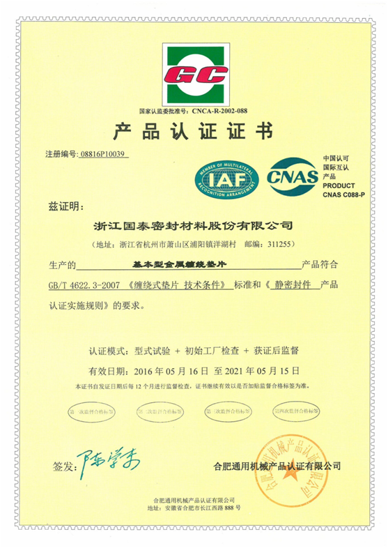 近日,我司收到合肥通用机械产品认证有限公司的通告和寄来的密封件产品GC认证证书,标志着我司产品质量符合相应标准,可获得和使用GC认证标志及认证证书。证书共8份,分别对应以下产品:(1)基本型金属缠绕垫片;(2)带加强环型金属缠绕垫片;(3)复合增强垫片;(4)非金属平垫片;(5)金属垫片;(6)柔性石墨垫(板);(7)编织填料;(8)模压填料 。