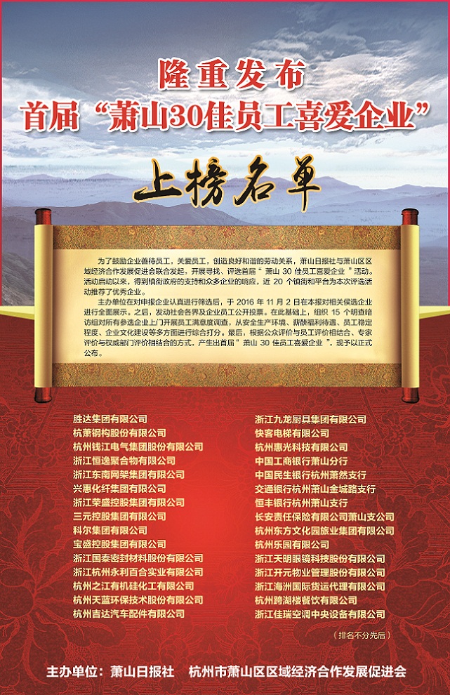 1月18日,由萧山日报社和萧山区区域经济合作发展促进会联合发起的首届“萧山30佳员工喜爱企业”活动公布榜单,浙江betway西汉姆联官方网站密封材料股份有限公司等30家企业被评为“萧山30佳员工喜爱企业”!