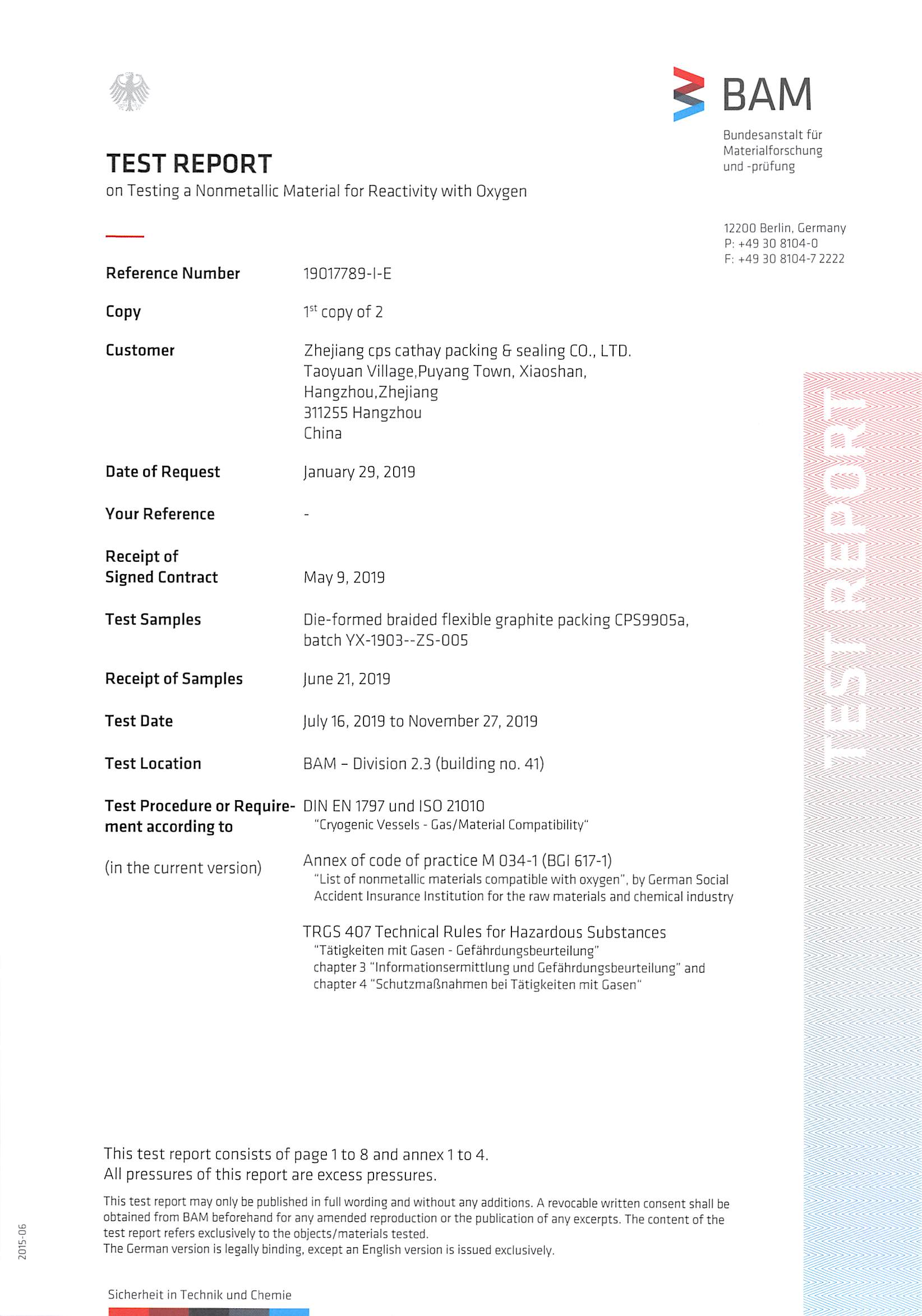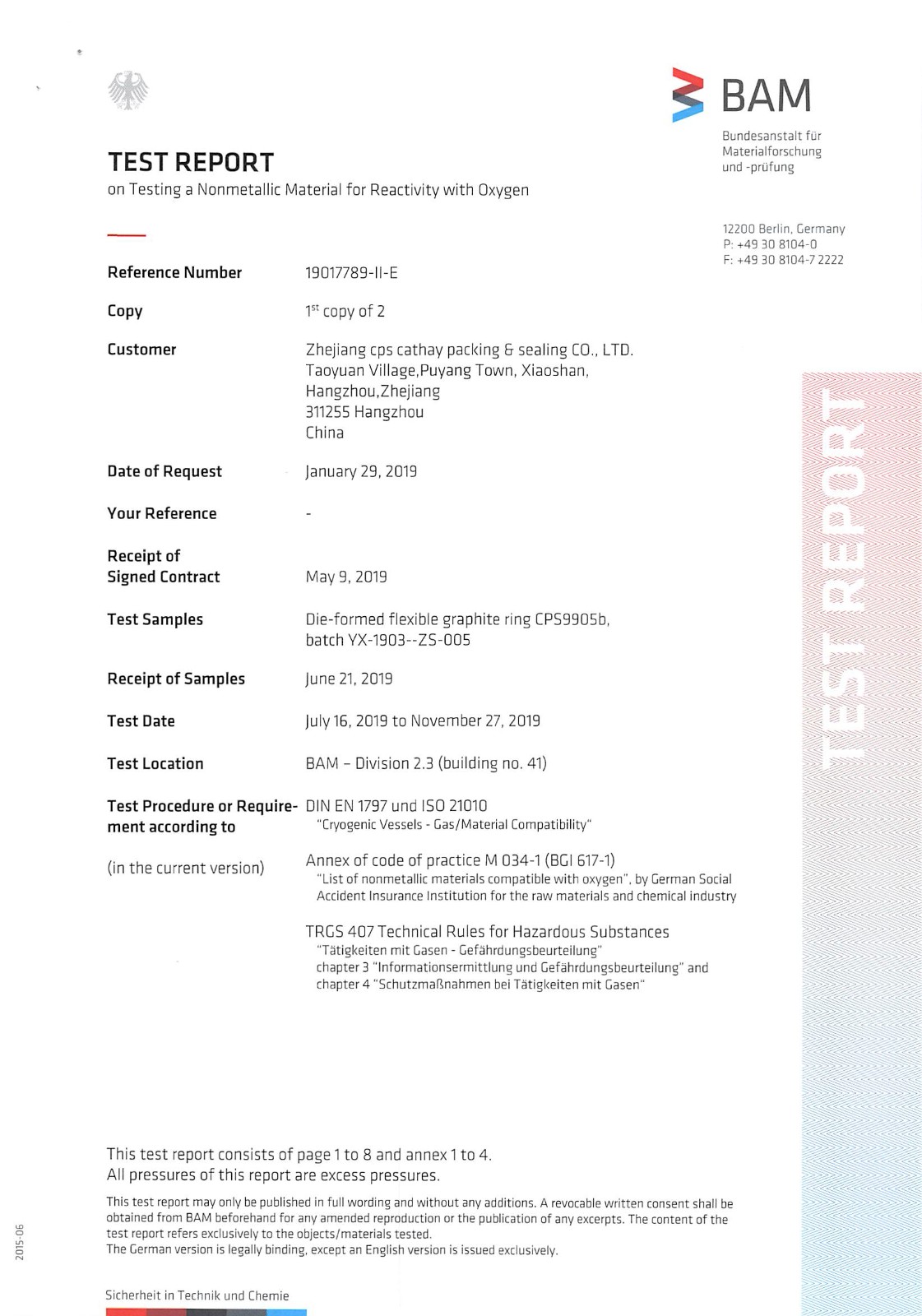 端环和密封环材料通过BAM氧用测试